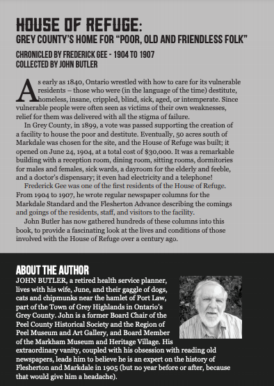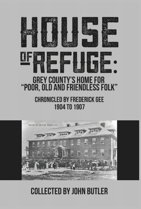 Built in 1904, just south of Markdale where Grey Gables is now located, the House of Refuge provided a residence for “the poor and destitute.” John Butler has collected resident Frederick Gee’s newspaper accounts of his life there from 1904 to 1907, providing an insider’s look at the comings and goings, staff and conditions in what was quite a modern building of its time.